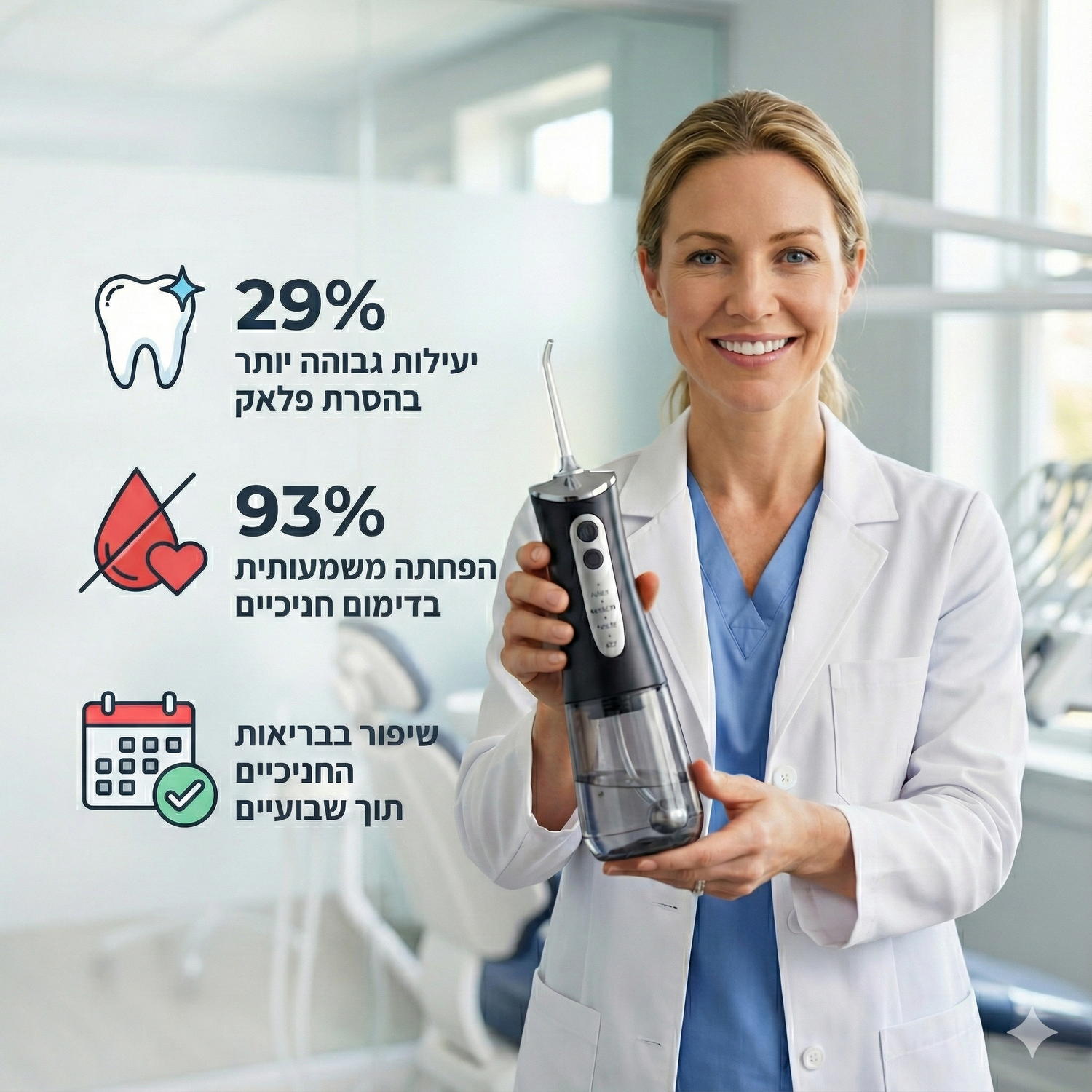 • הפתרון לחניכיים מדממות: מפסיקים את הרגישות. הסילונית מספקת עד 93% הפחתה בדימום בחניכיים, ויעילה עד 52% יותר בהפחתת דלקות (Gingivitis) לעומת שימוש בחוט דנטלי.
