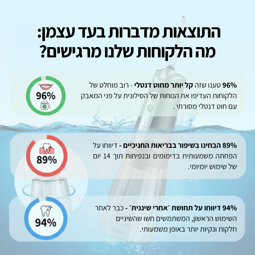 בדיוק בשביל זה פיתחנו את מצב ה-Soft. אם החניכיים שלך מדממות כיום, זה סימן שיש דלקת (בגלל לכלוך שמצטבר). השימוש בסילונית מבצע "עיסוי" לחניכיים, משפר את זרימת הדם ומפחית את הדימום משמעותית תוך שבועיים של שימוש. התחילו בעוצמה נמוכה ותראו איך הבריאות חוזרת לחניכיים.